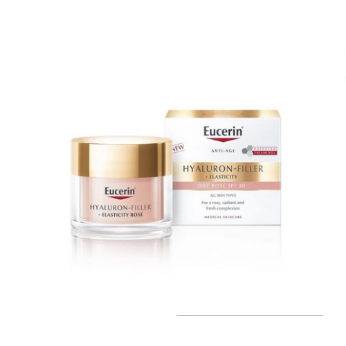 Eucerin Hyaluron-Filler + Elasticity Dnevna krema SPF 30 Rose je dnevna anti-age krema koja popunjava duboke bore, poboljšava elastičnost kože i ublažava hiperpigmentacije. Zahvaljujući pigmentima, ova krema pruža blago ružičast efekat, čime koriguje bled i umoran izgled kože i vraća licu blistavost.